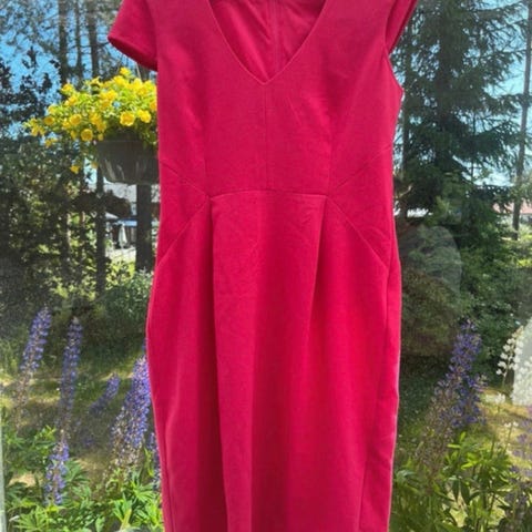 En elegant röd/rödrosa klänning ifrån MQ, med ett volangigt mönster framtill, samt knappar och snörning i midjan som knytes baktill. Känningen är i mellanlång storlek.