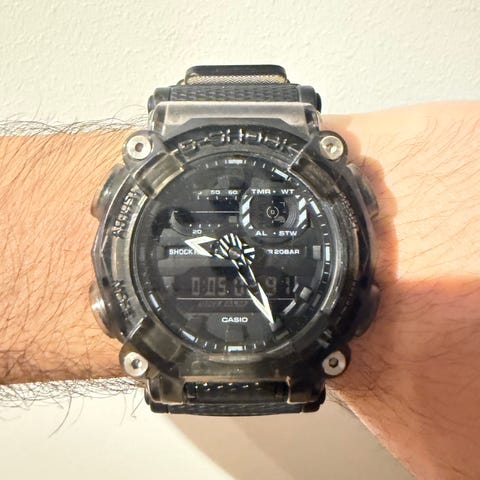 Casio G-Shock armbandsur i svart utförande. Klockan har analog och digital visning samt robust boett och armband i syntetmaterial. Visarna är tydligt markerade och urtavlan har flera funktionsfönster. Modellen är utformad för vardagsbruk och aktiviteter där en tålig klocka behövs.