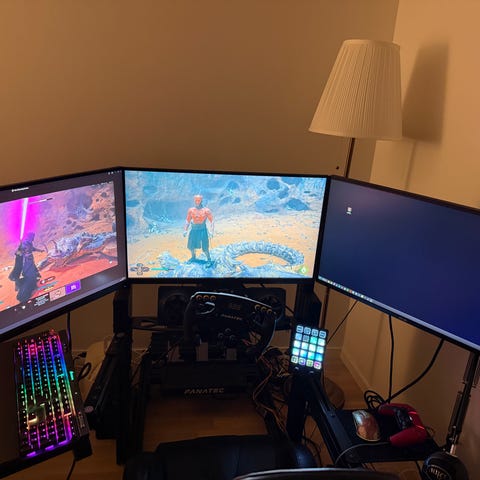 Hej har tappat suget för gaming och där med vill sälja min setup tagit några bilder. Allt som är på bilderna ingår!!! Kom med rimliga bud. Ni får med ett helt kitt hörlurar, mus tangentbord, 1skärm stativ till 2 ratt och sidopanel, samt två joystick, musmatta och mycket annat hör av er om ni är intresserade, kan även få med bord och stol. PRIS GÅR ATT DISKUTERAS VID SMIDIG OCH BRA AFFÄR