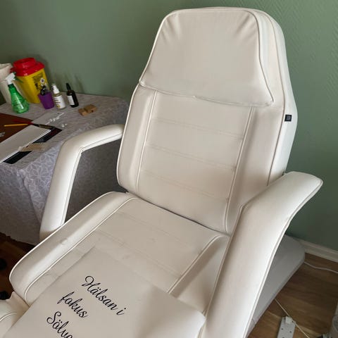 Vit behandlingsbänk med justerbar rygg- och bensektion. Stoppad liggyta med armstöd och stabil metallstomme. Passar för exempelvis skönhetsbehandlingar, massage eller fotvård i salong eller hemmamiljö.