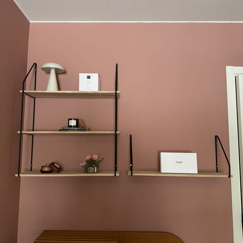 Stilrent och modulärt hyll-/skrivbordssystem med hög materialkänsla.