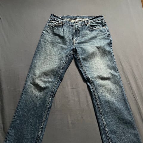 Herrjeans i blå denim med tvättad effekt. Storlek 56 med midjemått W36. Byxorna har raka ben med detaljerade sömmar och förstärkningar över knäpartiet. Klassisk femficksmodell med fram- och bakfickor samt hällor för bälte. Passar som vardagsbyxa för herr.