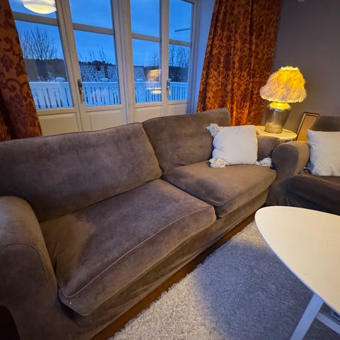 Vi ska byta ut våra sköna favoritsoffor i stoppad dun! Gratis mot hämtning i Tyresö enl överenskommelse! Rökfritt villa hem. Bord ingår - alt högsta bud först till kvarn!