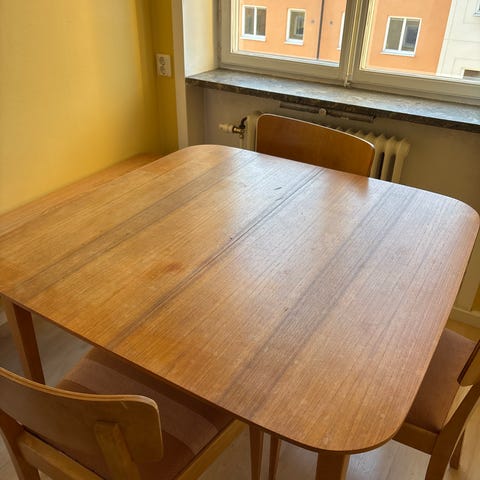Bord i teak fr 60-talet, med två inläggsskivor. Utan inläggsskivor: 135x84,5cm, höjd 74, inläggsskivor 40cm.