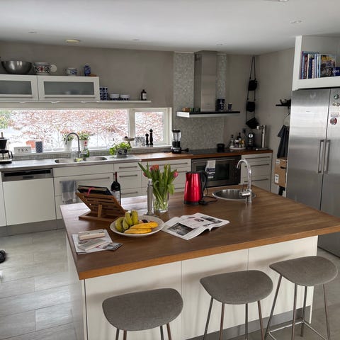 Köksskåp och köksinredning vit med bänkskiva mörk
