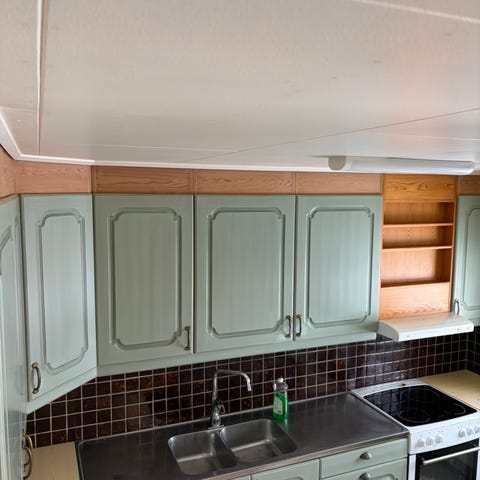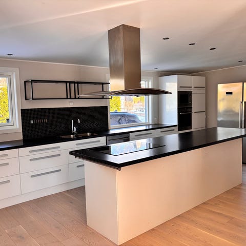 Köksskåp och köksinredning i vit färg med släta luckor och lådor samt rostfria handtag. Bänkskiva i mörk färg. Inredningen omfattar hörnskåp, överskåp, underskåp med hyllplan och utdragbar trådkorg. Köket är utrustat med inbyggd ugn, spishäll, fläktkåpa och kyl/frys i rostfritt utförande. Passar för montering i komplett kök eller som komplettering av befintlig kökslösning.
