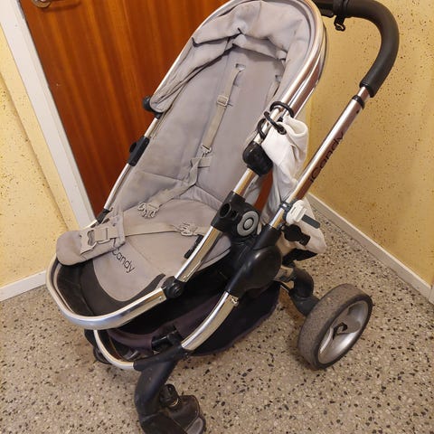 Sport barnvagn med sittdel och tillhörande babyskydd i gul och grå färg. Vagnen har större hjul bak och mindre fram, samt justerbart handtag. Sittdelen är vadderad med sele för barnet. Babyskyddet har matchande klädsel och medföljer tillsammans med tillbehör som åkpåse och skötväska i samma färger. Passar för transport av spädbarn och småbarn i vardagen.