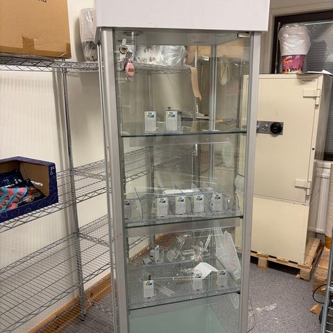 Humidor skåp i trä med glasdörr. Skåpet har flera hyllplan och utdragbara lådor anpassade för förvaring av cigarrer. Invändigt finns fackindelning för sortering samt en inbyggd display för övervakning av klimatet. Passar för förvaring av cigarrer i hemmet, kontor eller liknande miljö där jämn luftfuktighet önskas.