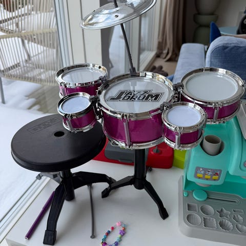 Fisher-Price leksakstrumma i plast i röd och grön färg. Trumman har vit trumyta och levereras med två gula trumpinnar som kan fästas i snöre på sidan. Lämplig som musikinstrumentleksak för barn för enkel rytm- och ljudlek.