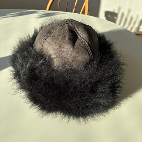 Mössa med nedvikbara öronlappar i skinn (vet inte vilken sort). Innerstorlek ca 60 cm, skickas inte