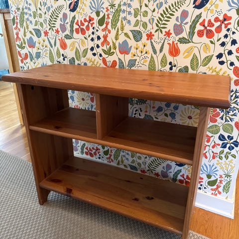 en gammal oanvänd hylla tillverkad 1992 av privat snickeri.