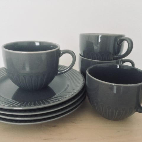 IKEA muggar i porslin med svart insida och vit utsida med svarta ränder. Passar för servering av varm och kall dryck i kök eller vardagsrum. Säljs som set enligt bild.