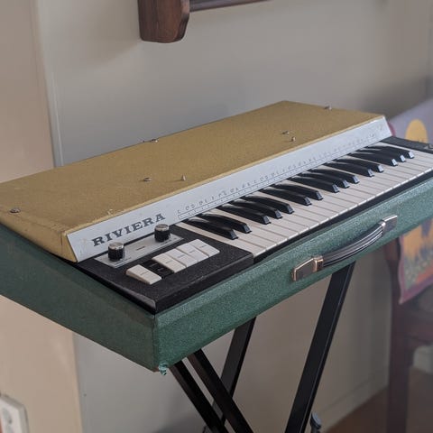Röd Elorgel Farfisa Compact i behov av omvårdnad