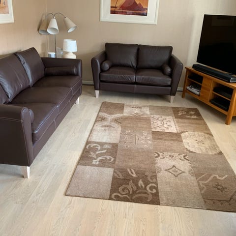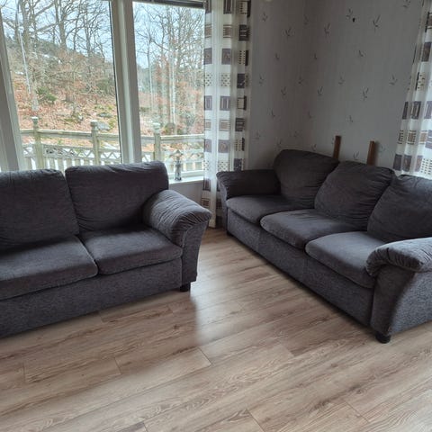 Sofforna är i fint skick klädda i brun textil utan förslitningsskada. Bordet är från Artwood mått (b d h) 120 x 61 x 45,5 cm