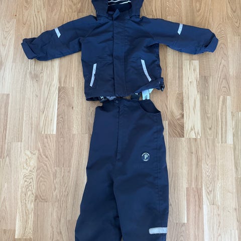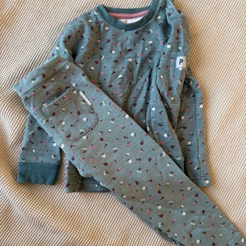 Polarn O. Pyret set barnkläder för flicka i storlek 92. Setet består av ett tvådelat mjukt underställ/pyjamas i mönstrad trikå samt ett tvådelat fleece- eller mysdress-set i grått. Överdelen i trikå har lång ärm och knappar vid axeln, tillhörande byxa har resår i midjan. Fleece- eller mysdressen består av tröja med halv dragkedja framtill och byxa med resår i midjan. Färgskalan går i grått och dova toner. Passar som vardagskläder, lager-på-lager under ytterkläder eller som mys- och sovplagg.
