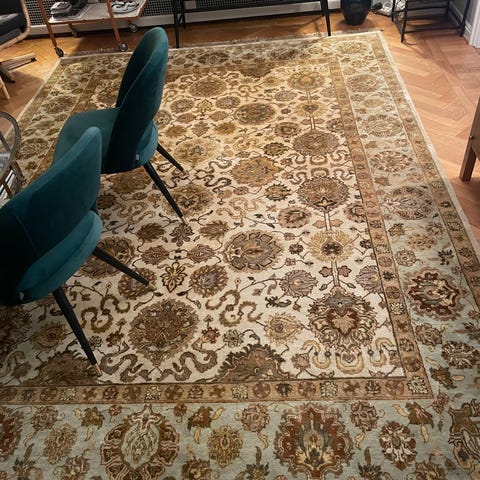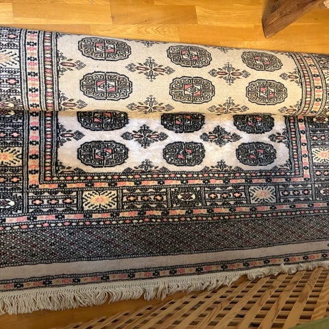 Klassisk sisal matta i bra skick. Inga synliga fläckar men däremot har gummit under torkat men det påverkar inte funktionen. Det låga priset är satt med hänsyn till att gummit under har torkat och att mattan därför ”smular lite”.
