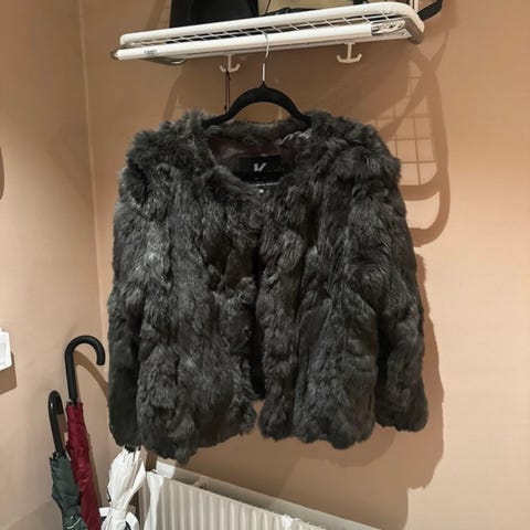 HM fuskpälsväst för dam i storlek L. Västen är flerfärgad i ett mönster med svarta och ljusare toner och har en mjuk, långhårig fuskpälsstruktur. Passar som ytterplagg eller som lager över tröja eller klänning vid svalare väder.