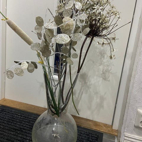 Ikea dekorationsvas med konstgjorda blommor. Vasen är rundad och tillverkad i färgat glas. Arrangemanget består av olika konstgjorda växter och blommor i gröna, vita och röda toner. Passar som inredningsdetalj i exempelvis vardagsrum, hall eller sovrum.