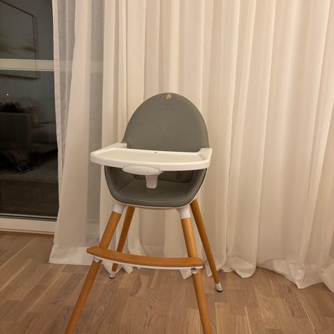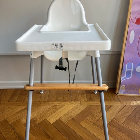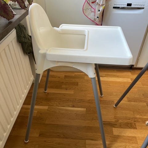 Antilop matstol från Ikea. Bricka och spännen. Svarta ben och ett fotstöd från JFR. Finns lite skav på benen och stolen är använd men i fullt fungerande skick.