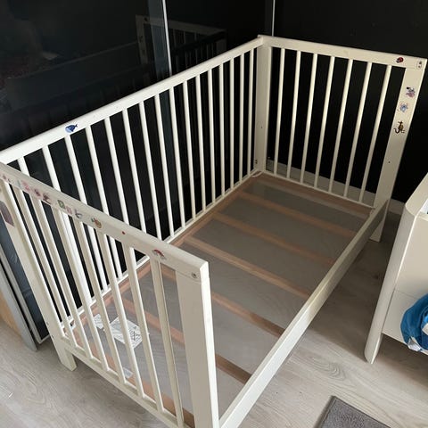 IKEA spjälsäng Gulliver, vit. Enstaka repa. Avtagbar långsida som kan ersättas med inkluderad stödbräda när barnet kan börja ta sig ur själv. Madrass, madrasskydd, kudde och täcke ingår. Allt tvättat.