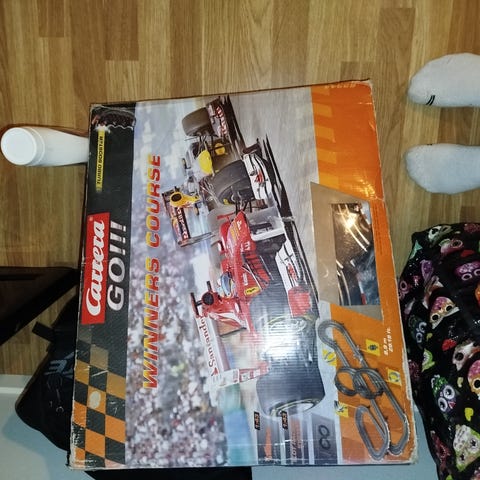 Bilbana i skala 1:32 med två F1-bilar, banbitar, handkontroller och stor originalkartong.