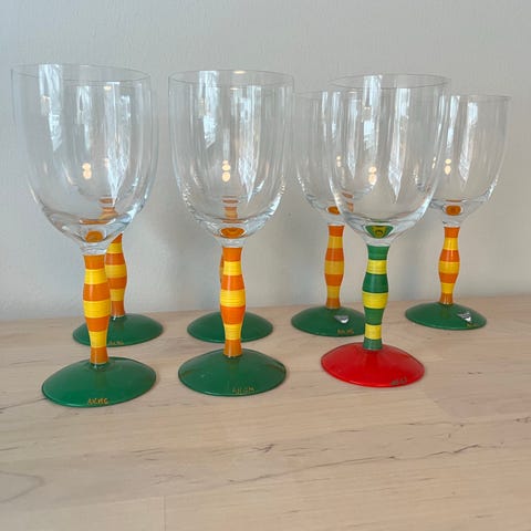 vinglas i glas med flerfärgad fot. Kuporna är klara medan stjälkarna består av staplade, färgade glaselement i blandade nyanser. Passar för servering av vin eller andra drycker vid dukning och fest. Säljs som uppsättning enligt bild.