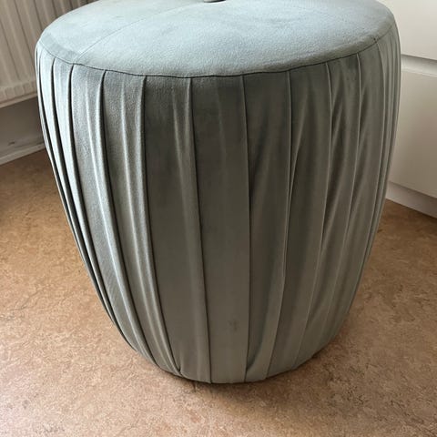 Mio sittpuff i rund modell. Puffen är klädd i grått tyg och har en kompakt, cylinderformad design som passar som extra sittplats eller fotpall i vardagsrum, sovrum eller hall.