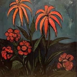 Keramiktavla med abstrakt mönster i rött, blått och beige. Tavlan består av flera glaserade keramikkakel monterade tillsammans i en rektangulär form. Motivet har organiska, snirkliga former och kontrasterande färgfält. Passar som väggdekoration i exempelvis vardagsrum, hall eller kök.