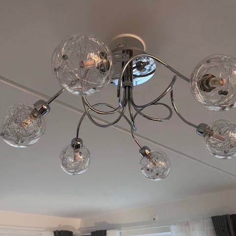 IKEA taklampa med flera runda glaskupor och metallstomme. Lampan har en central stång i metall med armar där kuporna är monterade. Passar som allmänbelysning i exempelvis vardagsrum, matsal eller hall. Designer: Verner Panton.