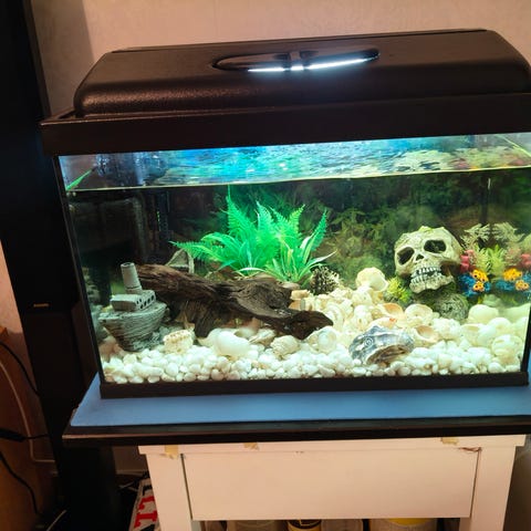 Akvarium med bänk och välvd front i glas. Akvariet står på en matchande bänk med stenliknande yta och öppna fack för förvaring under karet. Inuti akvariet finns grus, konstgjorda växter och dekorationer. Akvariet är utrustat med belysning i locket.