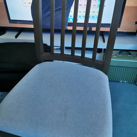 IKEA stol med träsrygg och stoppad sits. Stolen har en böjd rygg i mörkbetsat trä och en klädd sits med röd- och gulrandigt tyg. Passar som matstol eller extrastol i exempelvis kök eller vardagsrum.