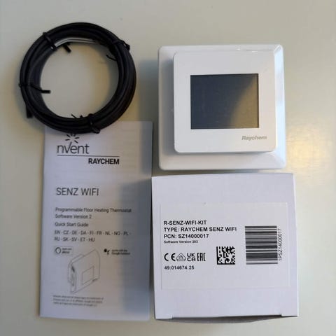 Fyra olika modeller , Ebeco, OJ Microline & NRG-DM golvvärmetermostat i vit färg. Termostaten är avsedd för styrning av elektrisk golvvärme och har digital display samt knappar för inställning av temperatur och funktioner. På bilderna syns även andra vita golvvärmetermostater med ratt- och knappreglage samt medföljande kablar. Produkten kan användas för reglering av temperatur i rum eller golv i bostäder och andra inomhusmiljöer där elektrisk golvvärme är installerad.