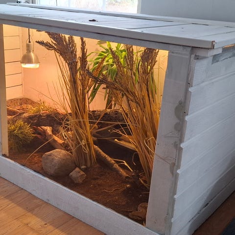 12 st terrarium med ställning med värme mattorplus div innredning mått djup 65cm hög 33 cm bredd 56 cm den är nermonterad och