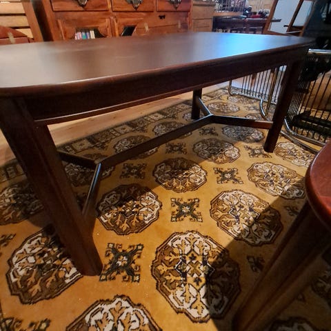 Ett rejält/tungt massivt bord i mörk/brunt trä.
