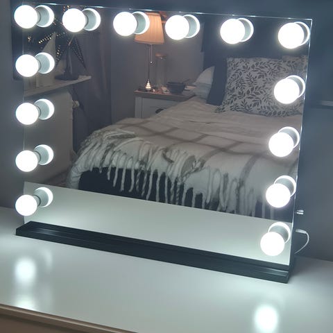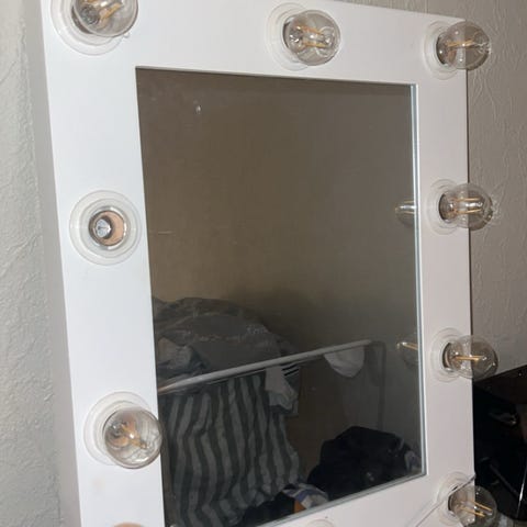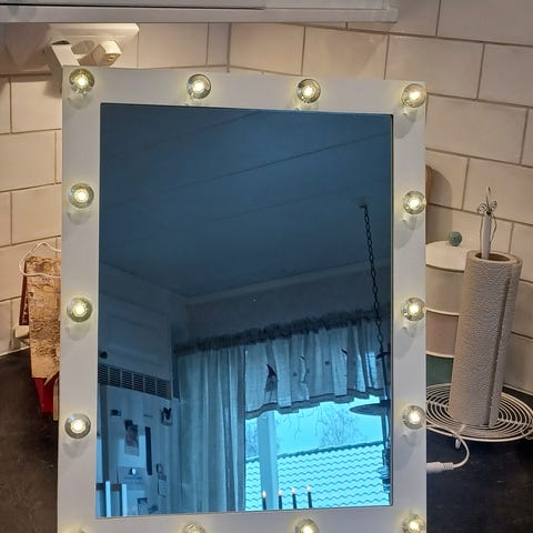 sminkspegel med belysning i storlek 20x30 cm. Spegeln har en vit ram och är försedd med flera runda lampor runt kanterna som ger jämn belysning vid sminkning eller annan detaljarbete. 3färger på lamporna (vit,blå och gulare belysning) går att höja/sänka intensiteten på ljuset.