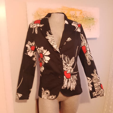 Kavajen är röd med vita prickar och är tillverkad i bomull, foder i polyester.