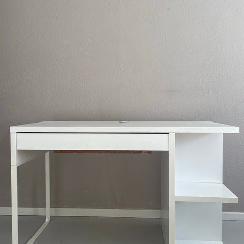 Skrivbord i vitt utförande med fyra lådor på vänster sida.
