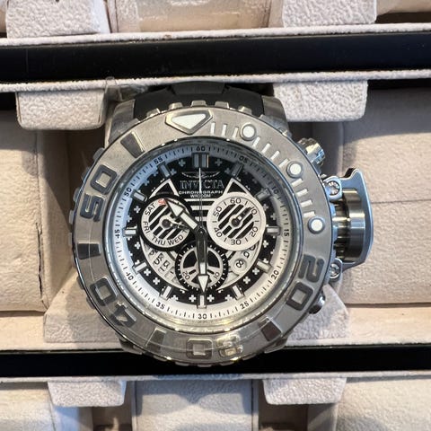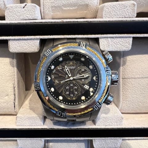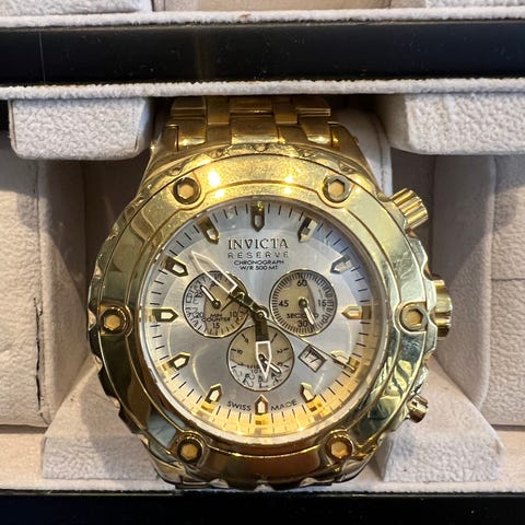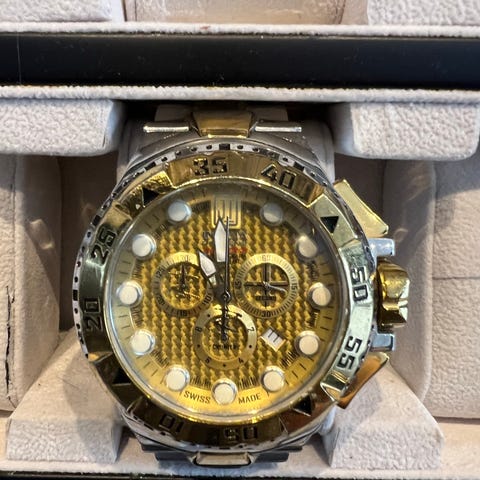 Invicta herrklocka i guldfärgad design med länkarmband i metall/stål. Urtavlan har flera delviskelett erade visare och subdials samt markerad vridring/bezel. Klockan är avsedd för män och har en robust boett med kraftig krona. Passar som armbandsur till vardag och fest. Detta är en av världens största urtavlor extrema 58 mm en klocka som syns och sticker ut i mängden. Passa på jag säljer min invicta klocksamling ( se bild ) jag har totalt 14 st klockor pris för alla 14 klockorna är endast 24995:- sek nypris långt över 150 000: