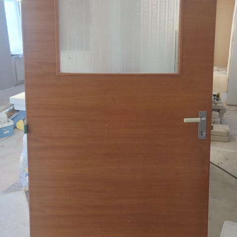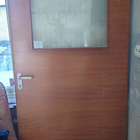 Innerdörr med karm i vitmålat trä. Dörrbladet har spegelpaneler och en glasöverljusi separat överljusdel. Utrustad med mässingsfärgat handtag och nyckelskylt. Passar som innerdörr i bostad eller liknande utrymmen där man vill släppa in ljus genom glaspartiet ovanför dörren.