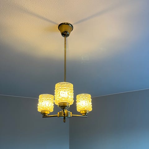 Taklampa i mässing med bärnstensfärgade glasskärmar från 1960-talet. Ger ett varmt och stämningsfullt ljus.