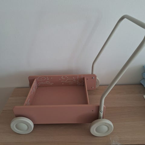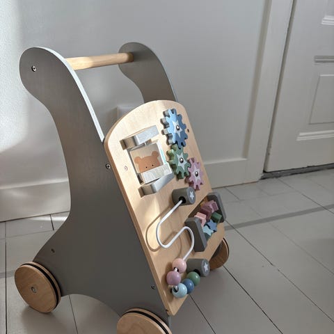 Rosa gåvagn med aktivitetstavla
