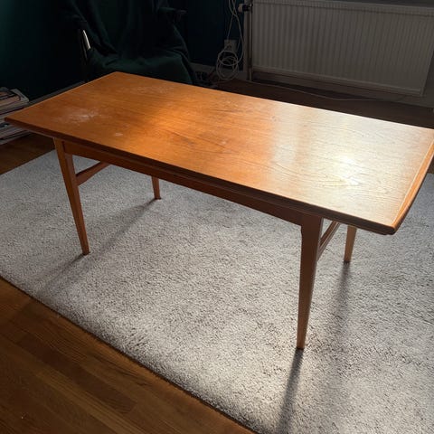 En jättefin vintage soffbord med motiv av kakelplattor kan behövas lätt slippas och oljas in bli som ny eller om man behåller som den är.