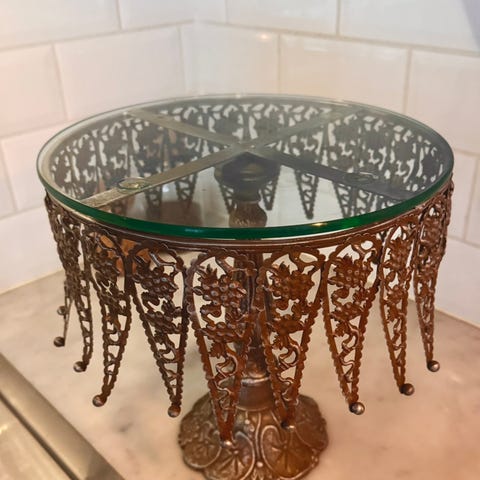 Dekorativ vintage serveringsbricka i glas och nysilver med handtag.