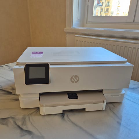 HP Envy Inspire skrivare multifunktion i vit färg. En allt-i-ett-enhet som är avsedd för utskrift, kopiering och skanning i hem- eller kontorsmiljö. Modellen har inbyggd färgskrivare och frontmatad papperskassett. Enheten ansluts med strömkabel och kan användas för utskrift av dokument och bilder från dator eller annan kompatibel enhet.