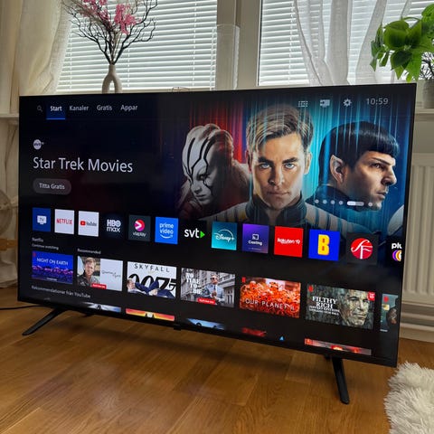 Philips TV med tillhörande soundbar. TV:n har smart-TV-funktioner med appar som exempelvis Netflix, YouTube och andra streamingtjänster. Bakom skärmen syns bakgrundsbelysning längs kanterna. Ljudet levereras via en separat, avlång soundbar som placeras framför TV:n. På ramen finns märkning från Bowers & Wilkins som indikerar samarbete kring ljudlösningen. Passar för film, serier, spel och allmän TV-tittande i vardagsrum eller liknande miljöer.