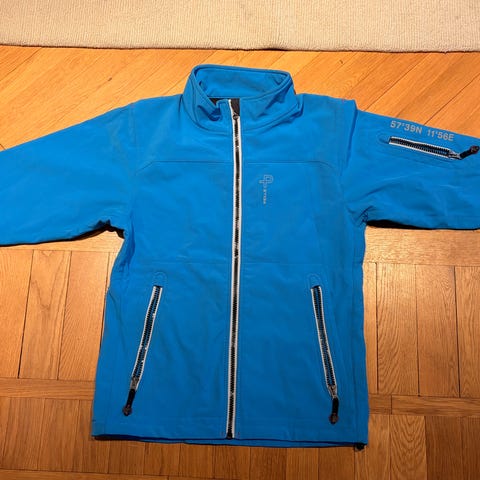 Norrøna skaljacka i grön färg med blå dragkedjor. Storlek M. Utrustad med huva, flera dragkedjeförsedda fickor på bröst och sidor samt justerbar nederkant. Jackan är avsedd som ytterlager för utomhusaktiviteter och vardagsbruk.