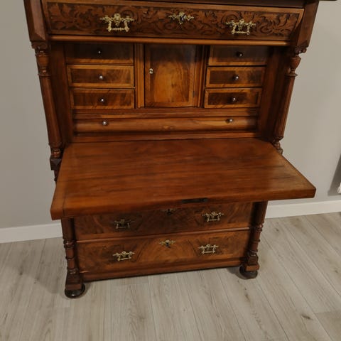 Sekretär i trä i brun färg. Möbeln har en nedfällbar skrivskiva och flera mindre lådor och fack upptill för förvaring och organisering. Nedtill finns större lådor som ger extra förvaringsutrymme. Passar exempelvis i vardagsrum, sovrum eller hall som skriv- och förvaringsmöbel.