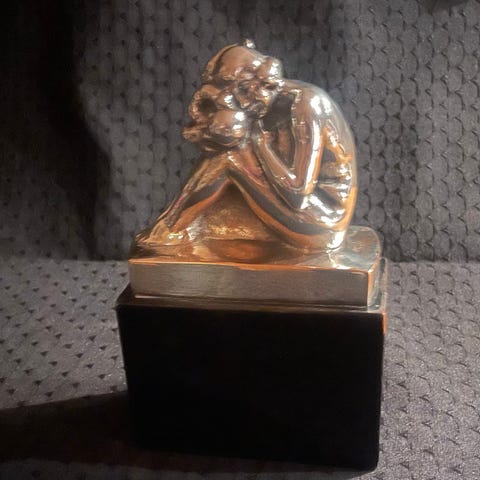 Säljer en patinerad bronsskulptur “My First Dollar” av Andreas Wargenbrandt.