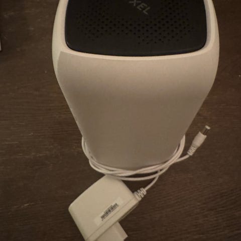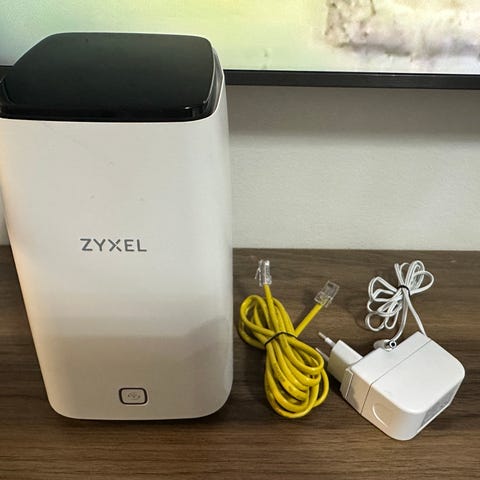 Zyxel NR5103E router i vit färg. Modellen är avsedd för trådlöst nätverk i hem eller mindre kontor. Enheten har nätverksportar på baksidan för anslutning av trådbundna enheter samt strömanslutning. Routern är utformad som en fristående enhet som placeras på plan yta. Passar för användning som central enhet i ett hemnätverk där flera enheter behöver dela internetanslutning via routerfunktion.