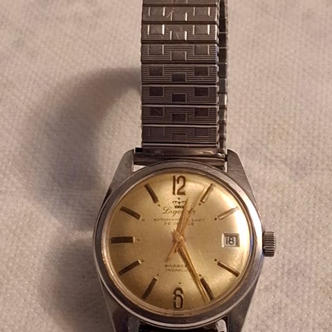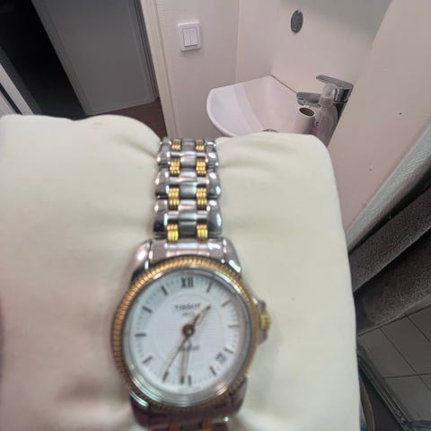 Tissot armbandsur för dam med silverfärgat metallarmband och klassisk analog visning. Urtavlan är tvåfärgad med svart ytterring och guldtonad mittdel. Boetten är i metall med rund form och mekanisk krona på sidan. Klockan har elastisk länkkonstruktion som gör den enkel att ta på och av. Passar som vardags- eller festklocka för den som söker ett mindre damur i metall med tydlig urtavla. Retro från 80talet. Eventuellt behövs batteriet bytas ut. Obs! Skickas inte